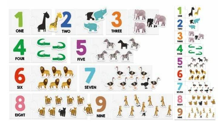 يقوم الطفل باختيار قطعة بازِل تحتوي على رقم، ثم يبحث عن قطعة أخرى تحتوي على كمية مطابقة من ظلال الحيوانات.